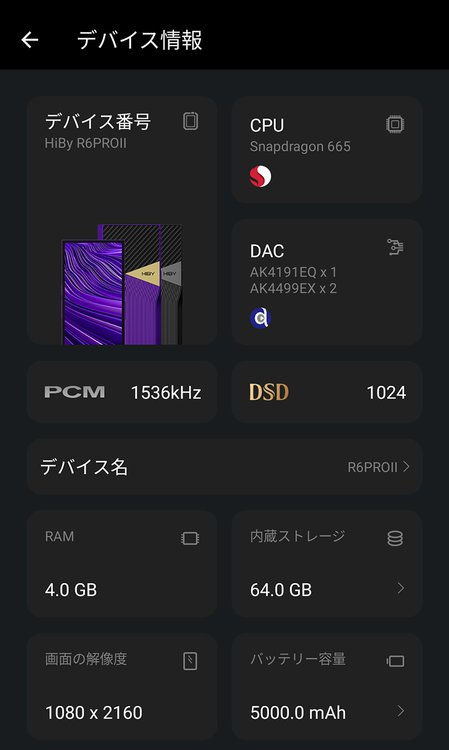 設定画面から確認できるR6 Pro IIのスペック。音質はもちろんのこと、スムーズな操作性も合わせて追求している