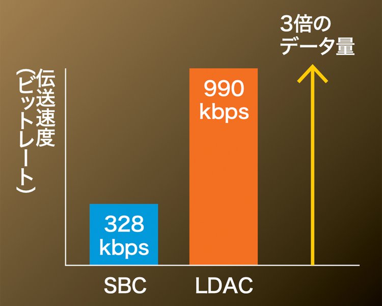 【ハイレゾ相当の高音質で聴ける】LDACに対応。最大96kHz/24bitまでのハイレゾオーディオ信号を圧縮して、SBCの328kbpsと比べて、最大約3倍の情報量となる990kbpsのビットレートでワイヤレス伝送できる。ハイレゾ相当の高音質をワイヤレスでも楽しめる