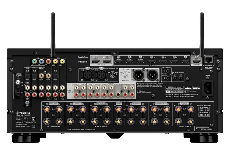 RX-A8Aの背面部。3芯タイプの電源ケーブルが接続でき、着脱に対応。eARC対応のHDMI出力を1基、アナログ音声の入力と出力にXLR端子を装備する