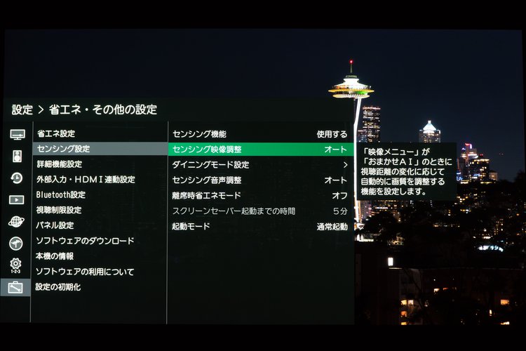 ミリ波レーダーを活用して視聴者の位置に最適化された映像・音声を出力する「センシング機能」の設定画面