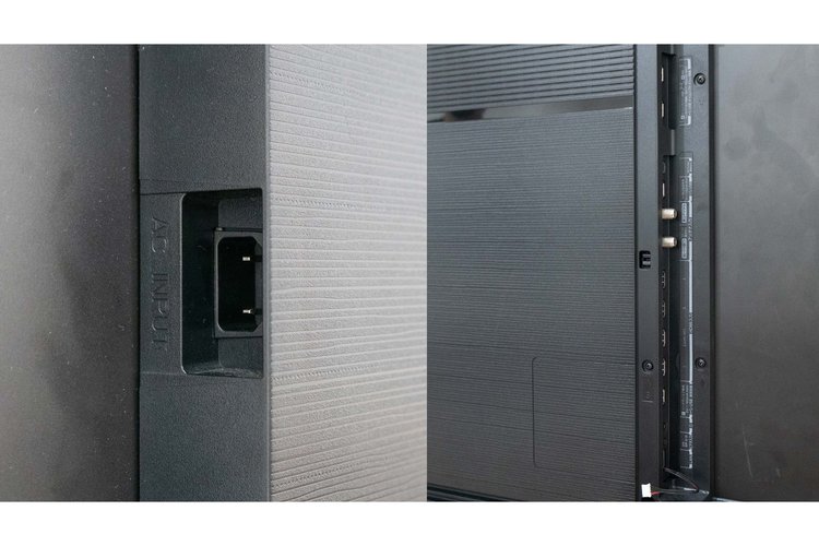 55X900Mの背面部。電源ケーブルの着脱に対応。HDMI入力端子は4基備え、そのうちeARC対応の端子を1基搭載。タイムシフトマシン用のHDDを接続するUSB入力も装備する