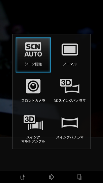 撮影時はシーン認識も可能。ソニーらしい機能として「3Dスイングパノラマ」「スイングパノラマ」も選択可