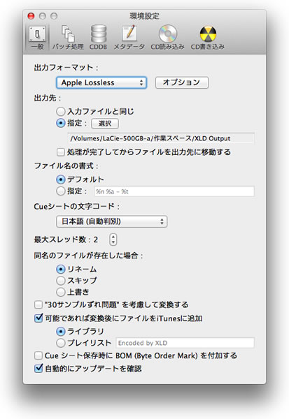 設定画面「一般」タブで読み込み形式とビットレート、ファイルの保存先フォルダを設定。「変換後にファイルをiTunesに追加」という設定も用意されている