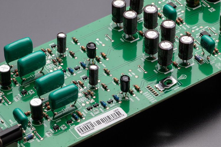 MM対応のフォノイコライザーを搭載。J-FET入力を採用し、パッシブDCサーボ回路を加えることで、ACカップリングコンデンサーを排除し、信号経路の純度を向上させている。銅箔を用いたフィルムコンデンサーなど、高品位なパーツを惜しげもなく採用する