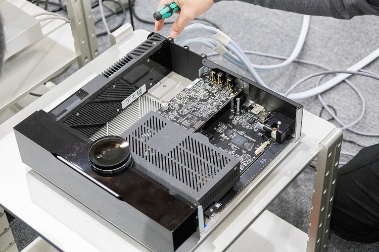 SELEKT DSM-KAの上蓋を開けたところ。右手前に見えるのが電源部。2段構成の上がデジタル基板、下がアナログ回路となっている