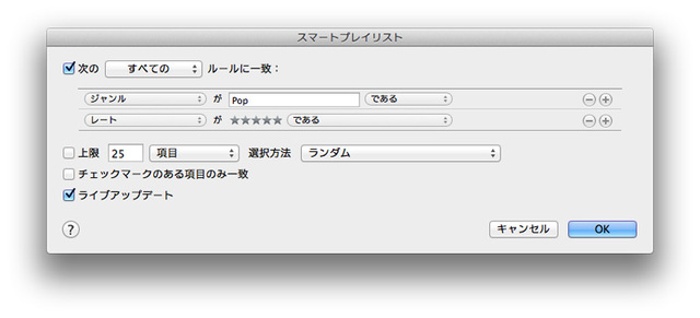 スマートプレイリストの作成画面。「ジャンルがポップでレート5つ星」の曲を抽出する設定例
