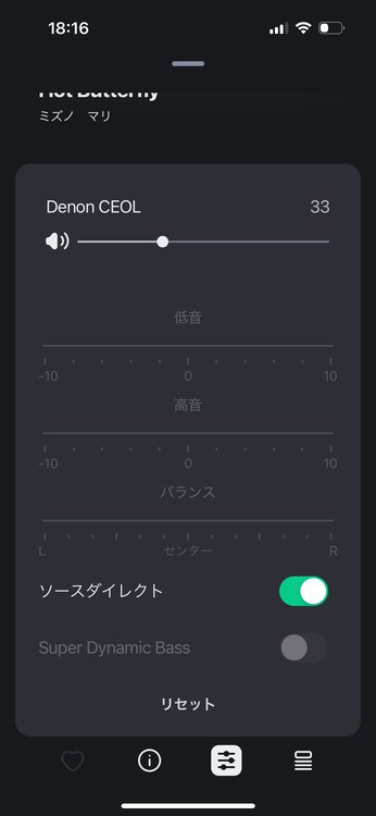 右下のボタンからEQなど調整が可能。「ソースダイレクト」もここから選択できる
