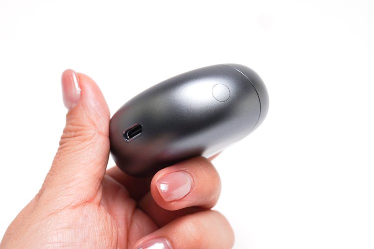 ケースの側面にボタンを配置。底面部には充電端子を備える