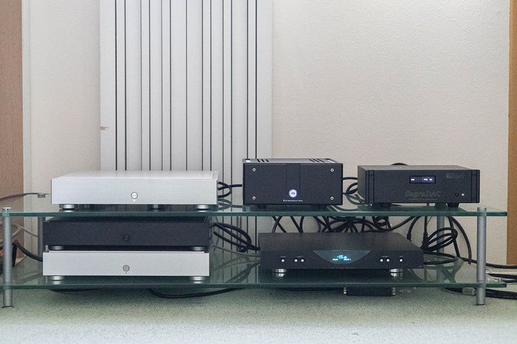左上が、今回使用するfidata「AS2」、DACにはEleven audioの「SagraDAC」を組み合わせ。アンプにはLINNのKLIMAX SOLOを使用した