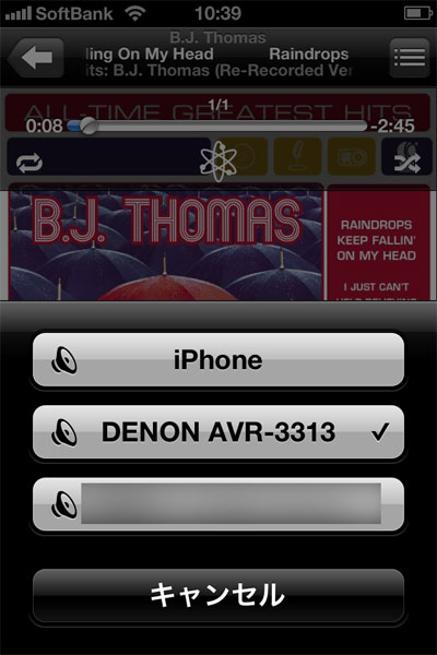 AVアンプとiPhoneを同じネットワーク上に接続すると、iPhoneの「AirPlay」アイコンをタップして使用可能な機器のリストに「AVR-3313」が表示されるようになる