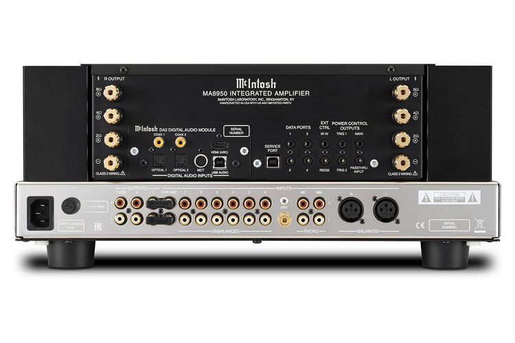 MA8950の背面端子。上位モデルと同じ「DA2モジュール」を搭載、MC/MM対応のフォノ部など基本機能は上位モデルと共通となる
