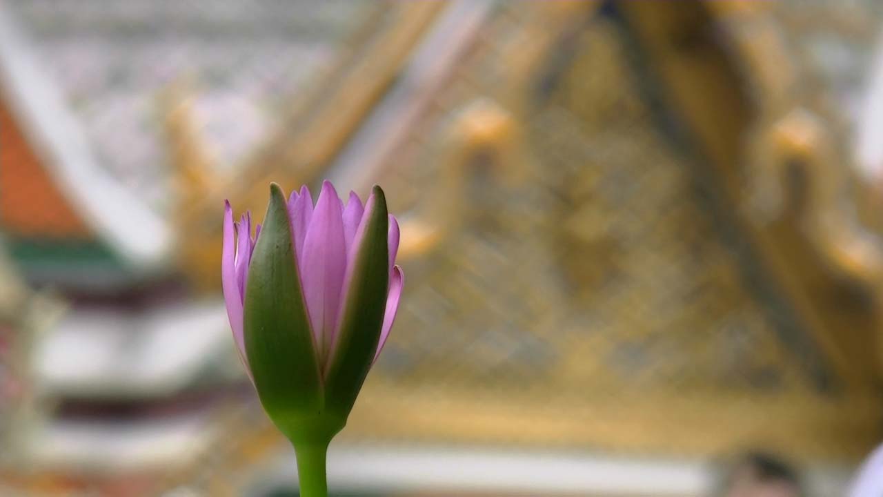 開きかけた蓮の花をズームアップし、背景にある寺院をぼかして撮影。花のピンクと緑の対比が素晴らしい