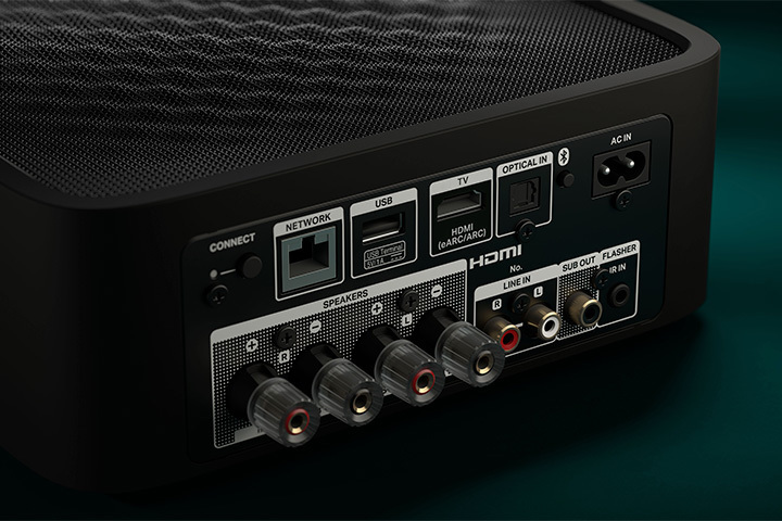 入力端子にはUSB-A、RCA、光デジタルをそれぞれ1系統装備。出力端子にサブウーファーアウトも用意。さらにHDMI(eARC)端子も搭載するため、テレビと接続してリビングオーディオも楽しむことができる。