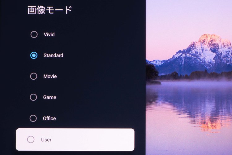 「画像モード」には、映像モード各種のほか、詳細の調整が可能な「User」も備える