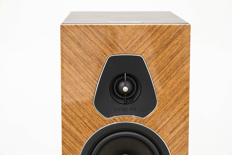 フロントバッフルは中央から45度の角度をつけた木目のデザイン意匠。近年のソナス・ファベールを象徴するデザインとなっている
