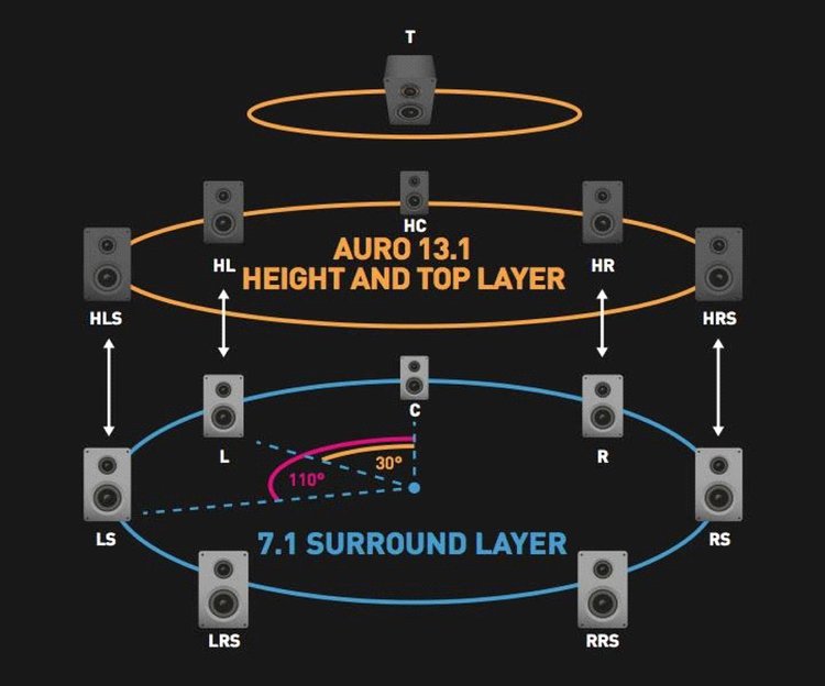 AURO-3Dのチャンネル配置。二次元的な5.1ch等ではなく、「ハイトレイヤー」(上方向)に音源を配置することで、より立体的・三次元的な音楽体験が可能になる