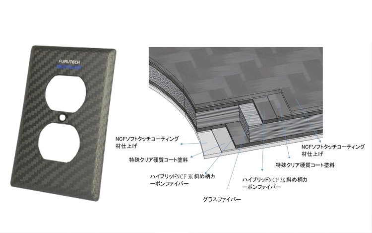 アウトレットカバー部はフラッグシップの「106-D Plus NCF」。EMC対策とNCFによる静電効果、NCFカーボンファイバーシート+ NCF調合特殊ダンピング塗装材料による制振効果の組み合わせで、ノイズを抑え、静寂感を高める