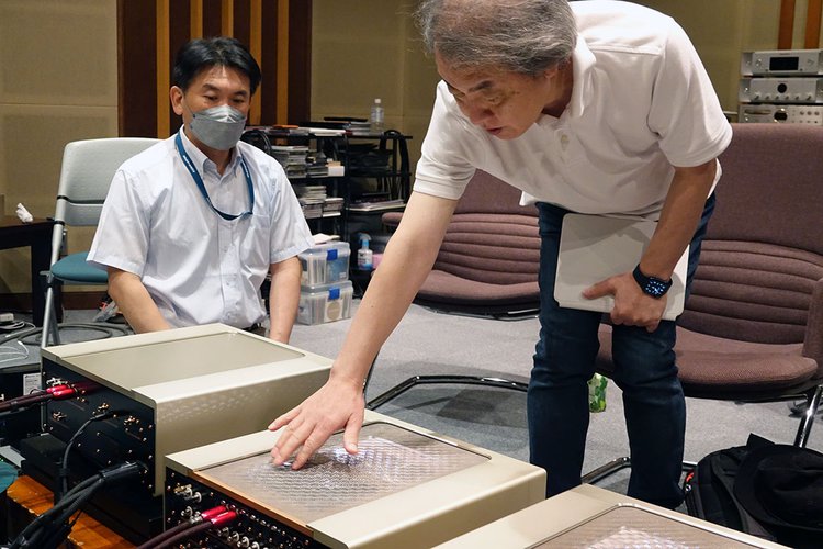 製品を確認する山之内氏。隣にはマランツ製品開発のキーマン、尾形氏の姿も