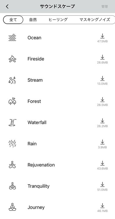オーディオテクニカのマイクで録音した自然音やマスキングノイズ、独自のヒーリングサウンドを再生できる「サウンドスケープ」