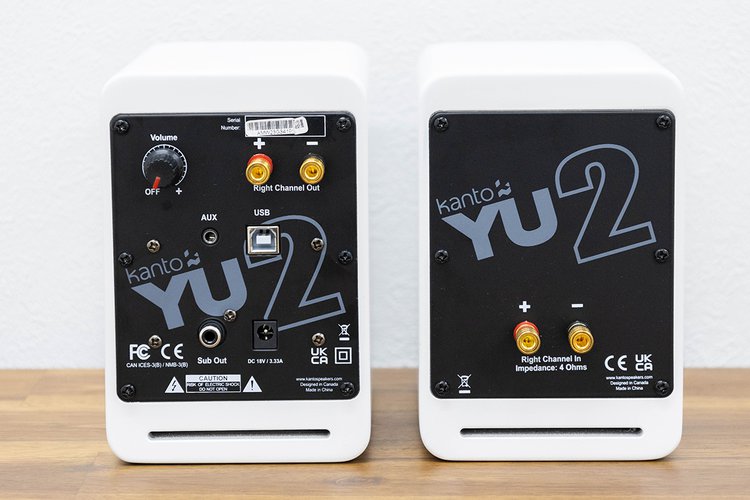 YU2の背面端子。片方にアンプが内蔵されており、付属のスピーカーケーブルで接続する。今回は3.5mmアナログケーブルでEC smartと接続した
