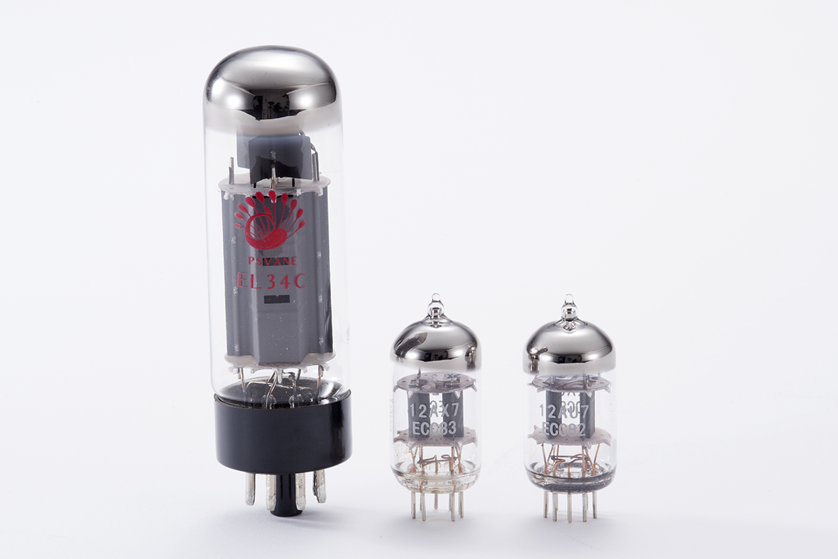 本機では、EL34(写真左)が4本、12AX7(写真中央)が1本と、12AU7(写真右)が2本用いられている