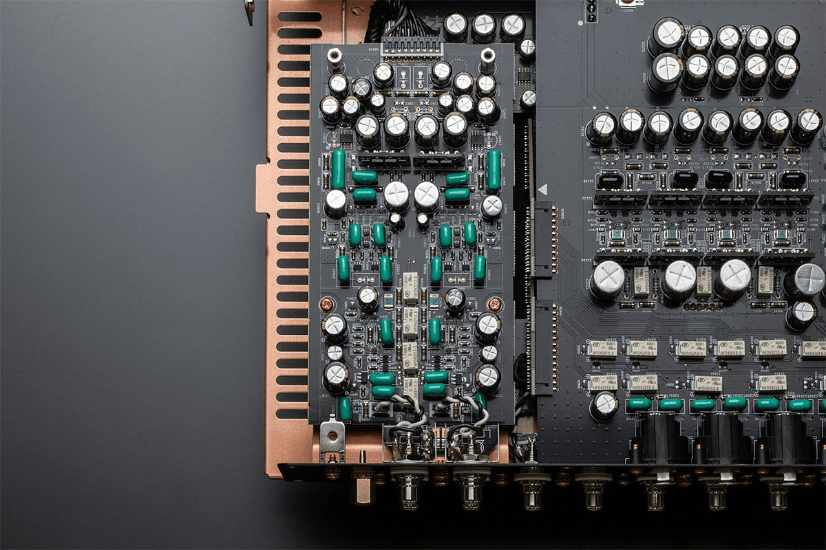 MM型、MC型両方式のカートリッジに対応する「Marantz Musical Premium Phono EQ」を搭載。20dBのゲインを持つMCヘッドアンプと40dBのゲインを持つHDAM+HDAM-SA3の無帰還型フォノイコライザーアンプの2段構成を採用する