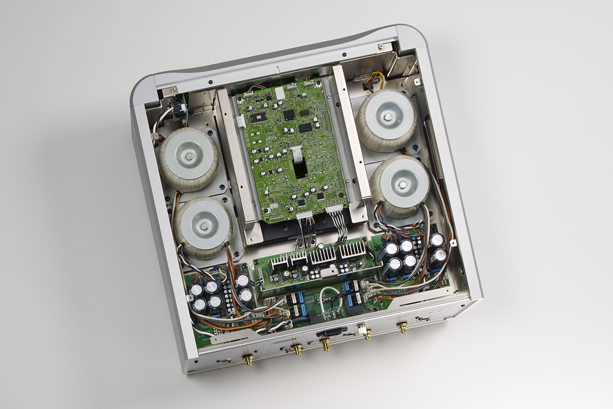 K-01XD SEの底板を外した内部。4基の大容量トロイダルトランスを搭載し、DAC部のLchとRchに各1基、メカニズム、デジタル回路をそれぞれ専用の電源トランスから給電する仕組み