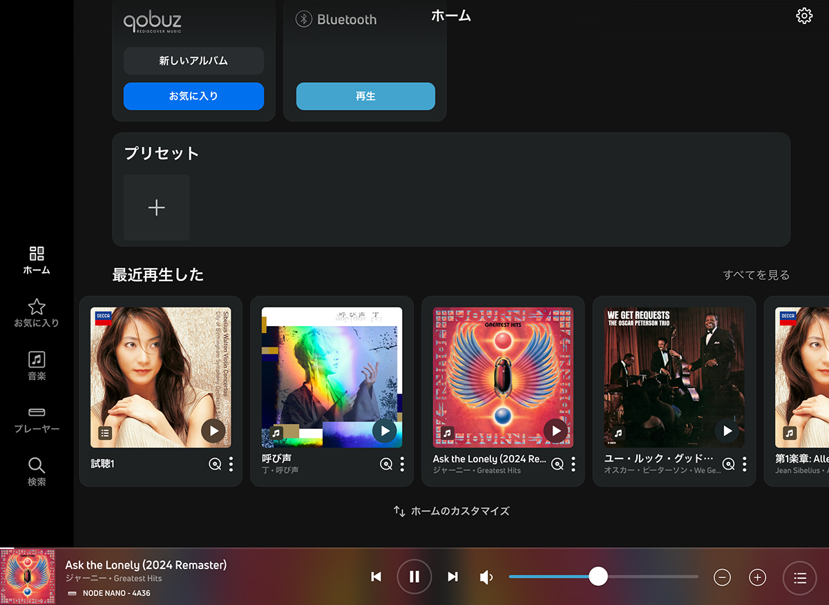 専用操作アプリ「BluOS」はもちろん利用可能。選曲や入力切り替え、ボリューム調整など主要機能はほぼ網羅