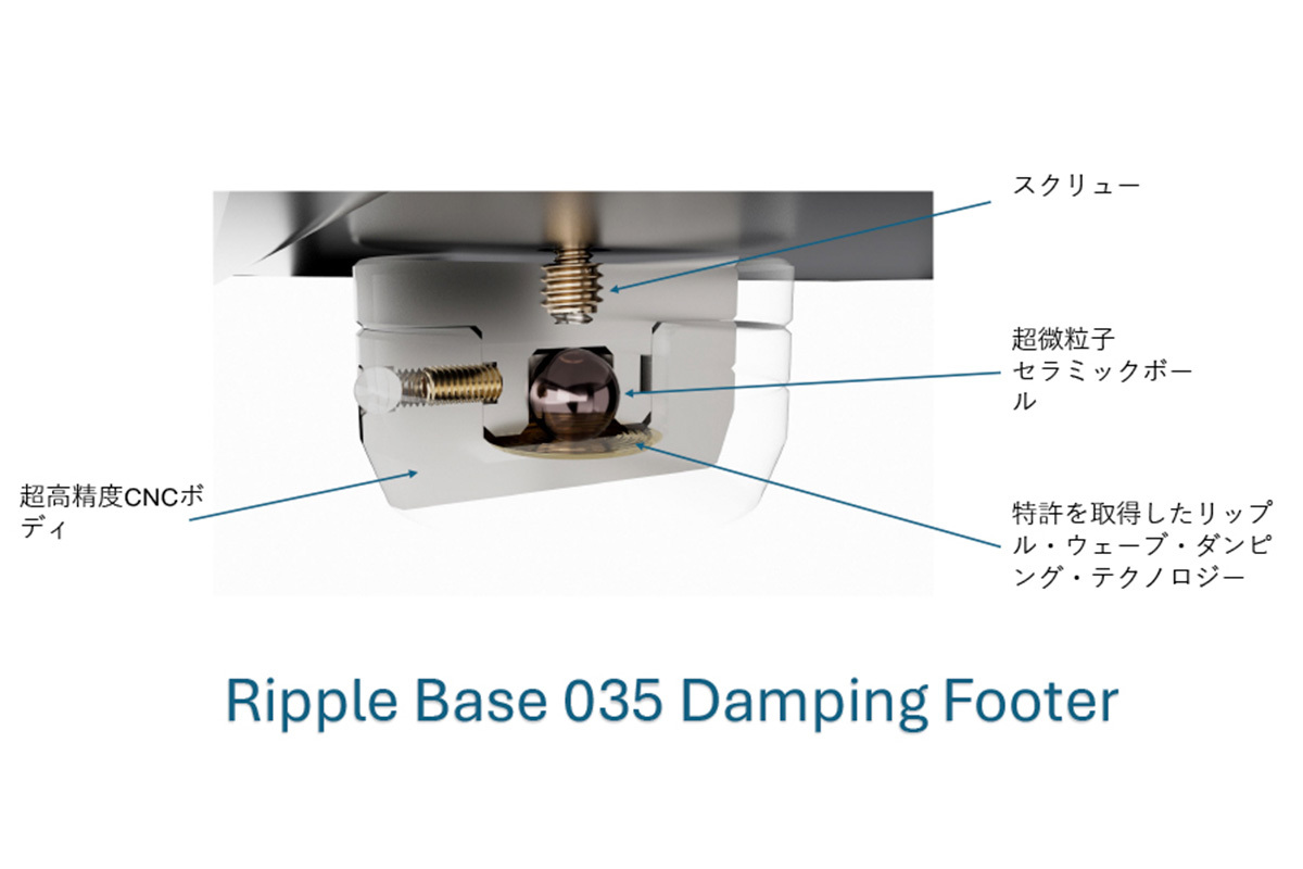 JPEMに搭載する超高精度CNCボディを採用したインシュレーター「Ripple Base Footer」。リップル・ウェーブ・ダンピング・テクノロジーは特許を取得している