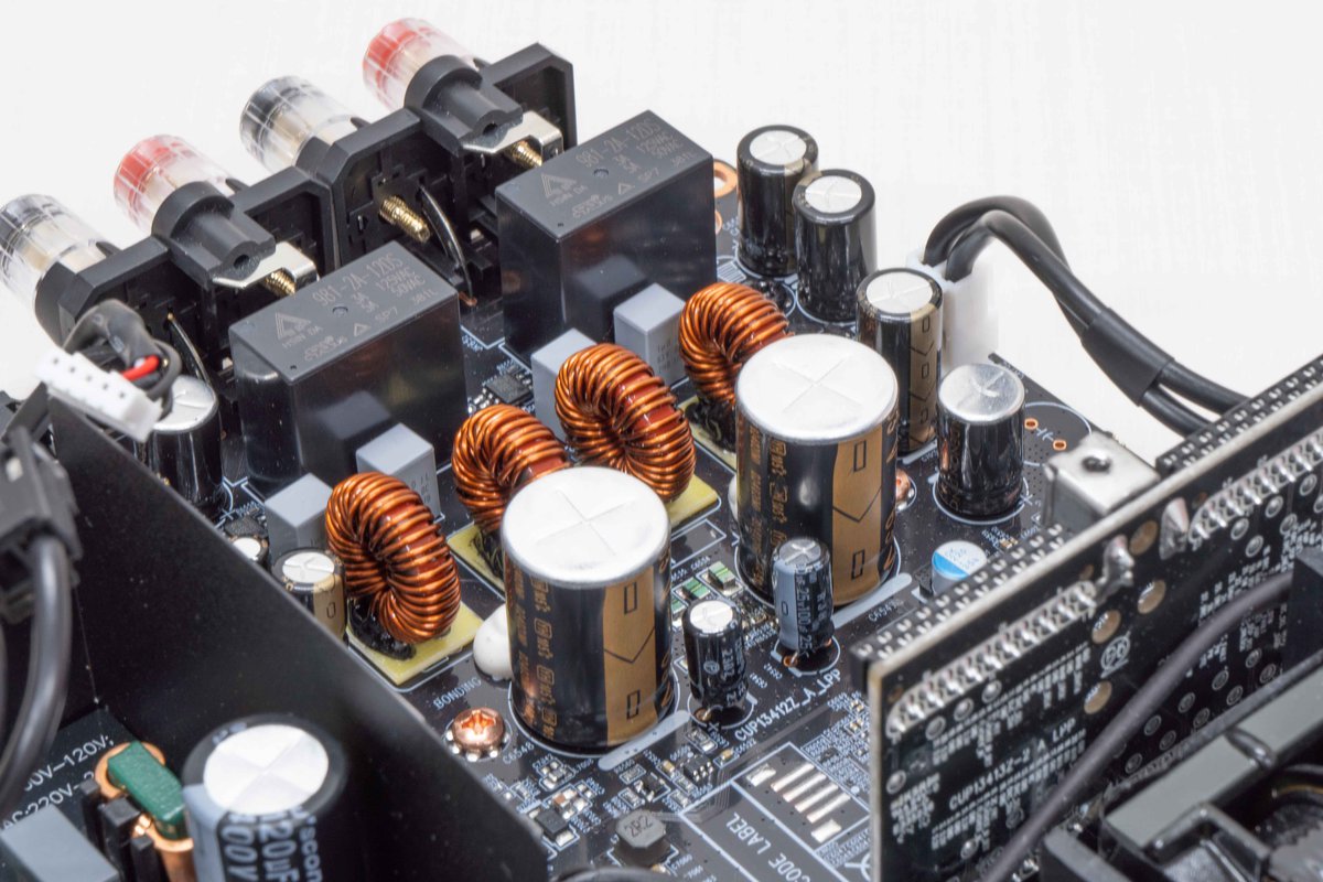 DENON HOME AMPの内部パーツ。パワーアンプ用の大型カスタムコンデンサーの新型を使用している