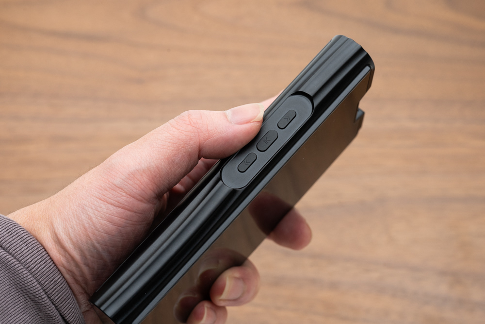 正面から見て右側にボリュームダイヤル、左側にボタンを配置