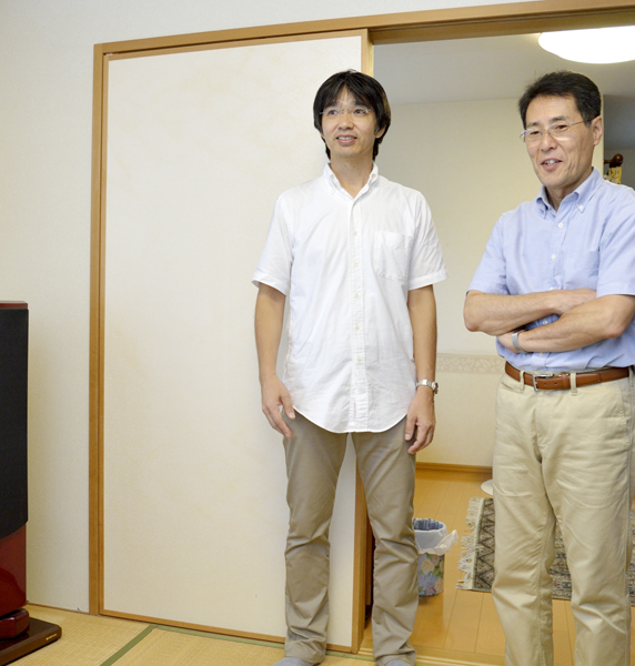 調音効果を確かめているヤマハの本地氏と安井氏。その背後には、隣のリビングと繋がっている襖が。ここまでずっと開けっ放しになっていた