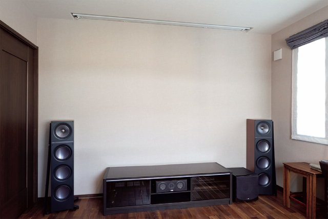 スクリーンは天井に掘り込みを作って隠蔽設置。機器類とセンタースピーカーはAVボードに収めている。壁面には絵を飾る予定とのこと