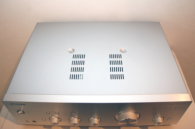 デジタルアンプのため放熱が少なく、天面のヒートシンクも小さい。結果、振動による影響低減につながるという