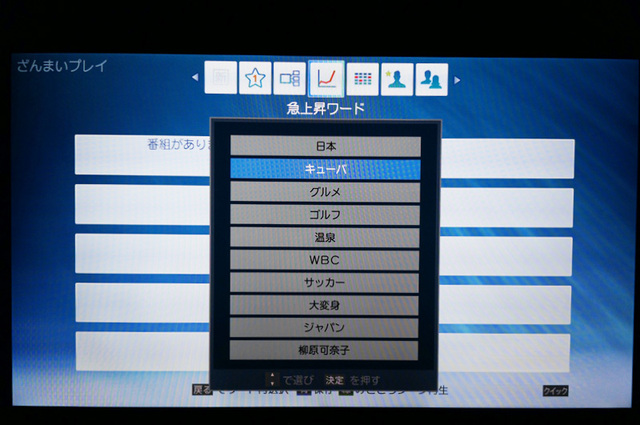 「急上昇ワード」はEPG情報に頻出するキーワードを自動でピックアップして表示してくれる機能。スポーツや芸能関連のトピックスがベスト10に並ぶ
