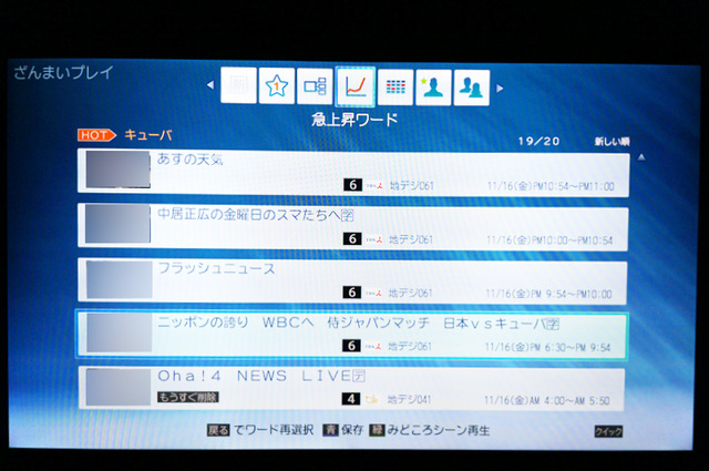 もちろんキーワード検索も利用できる。「キューバ」で検索すると、テストマッチで日本と対戦したキューバとのWBCに関連する番組が多くヒットした。ニュース番組も一気に探せるのがいい