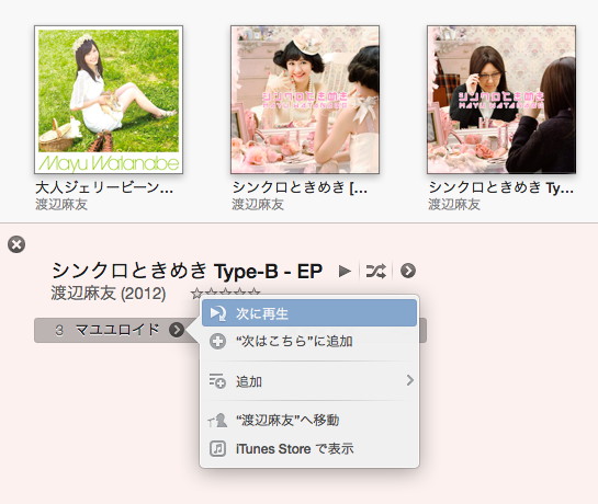 >メニューには「次に再生」と「”次はこちら”に追加」の他にも任意のプレイリストへの追加など便利な機能が用意されているのでチェック!
