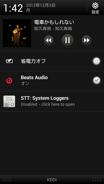 ヘッドホン/イヤホンを本体に接続すると、通知バーからBeats AudioのON/OFFを設定できるようになる