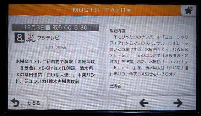 番組を選択すると番組詳細、関連番組などを表示できる。視聴や録画を予約する機能はない