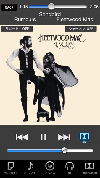 「T×DOLBY Music Player」で再生中の画面。Dolby Mobile有効時はDolbyロゴが青く点灯する