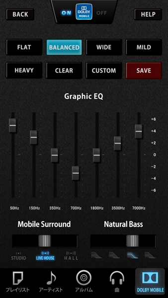 イコライザーは7バンド、「BALANCED」や「WIDE」などのプリセットが用意される