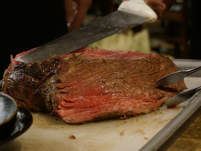 塊肉を店員がサーブしにきたところをオートモードで撮影(NEX-6を使用)。カメラをバッグにしまった状態だったのでやや急ぎ気味になってしまった割にはブレも少なく、肉のシズル感なども結構よく表現されているのではないだろうか