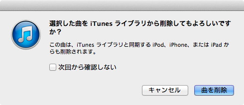 削除ダイアログその1。まずはここで「曲を削除」をクリックする