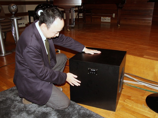 TD725swに手を当てて、エンクロージャーがほとんど振動していないことを確認する鴻池氏。ユニットが大きく前後する大音量時でも、筐体はまったくと言ってよいほど振動していなかった