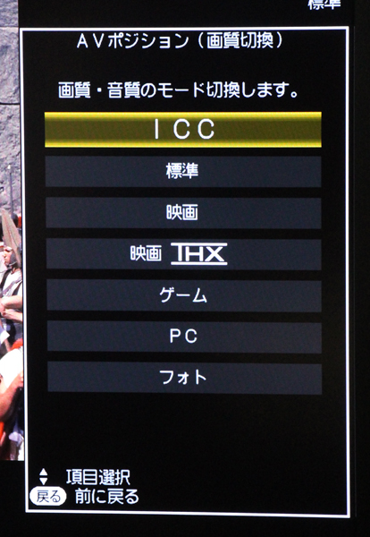 ICC PURIOSのAVポジションメニュー。「ICC」「映画THX」が新しい