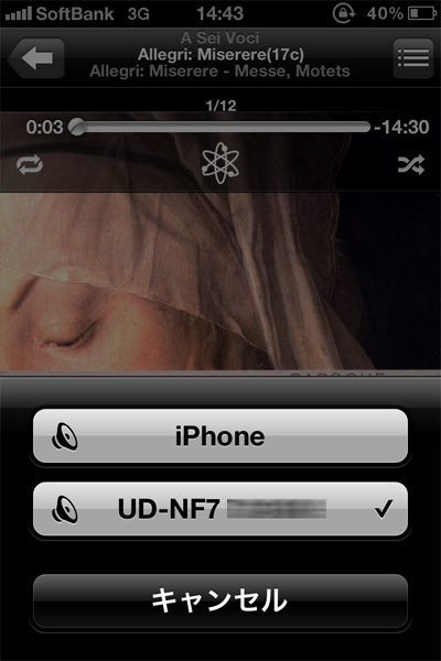 AirPlay再生の場合は、iOS機器の「ミュージック」アプリを立ち上げ、AirPlayアイコンをクリック。DLNA再生の場合は、対応アプリで出力先として「UD-NF7_xxxxxx」を選択する