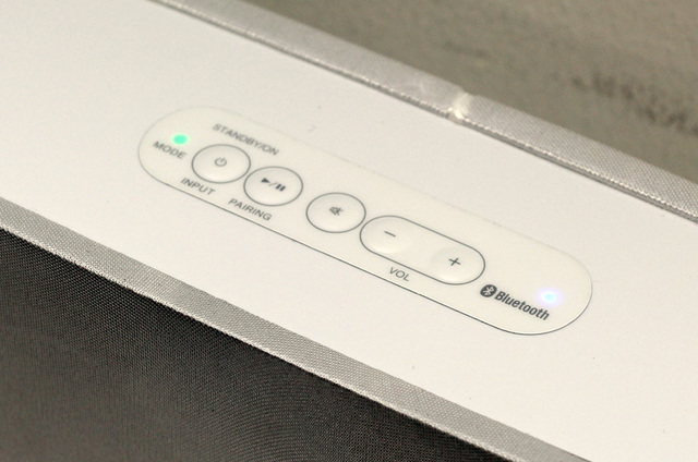 本体上部に設けられた操作ボタン。Bluetooth接続時はこのように光で教えてくれる