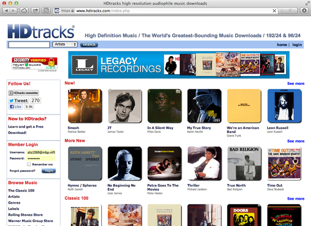 【1】HDtracksのトップページ。メニューや新着情報から作品のページに進んでもよいし、左上の検索ボックスでお目当ての作品を探してもよい