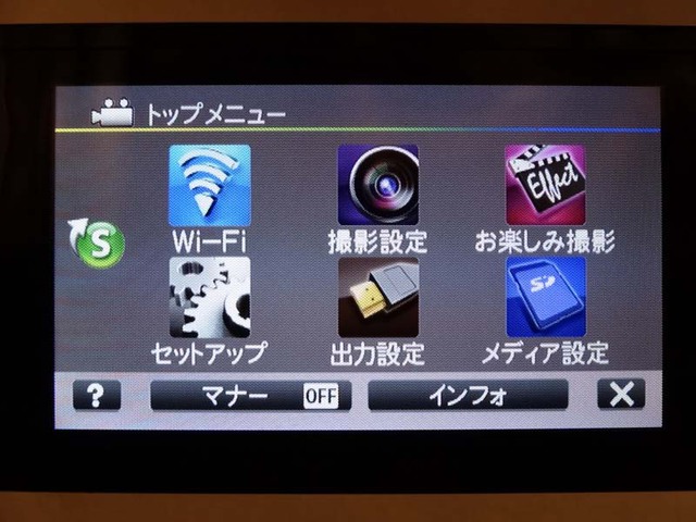 GZ-VX895のトップメニュー。Wi-Fi設定やお楽しみ撮影など多彩な設定がここから可能