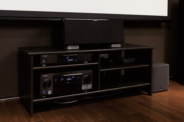 AV機器はスクリーン下方に設置したAVラックに納め た。テレビを置かないので、センタースピーカーをラック の上に置き、画面中央からセリフ音が出やすくなるよう に調整されている